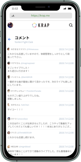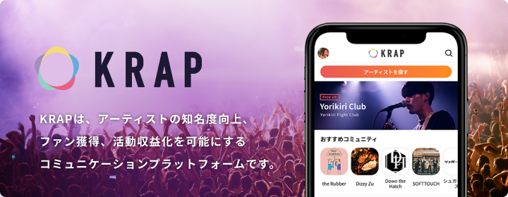 「KRAP(クラップ)」は、音楽活動を中心とするアーティストの知名度向上、ファン獲得、活動収益化を可能にするコミュニケーションプラットフォームです。「KRAP(クラップ)」は従来のアーティスト個別のファンクラブとは異なり、プラットフォーム上に複数のアーティストがコミュニティを作成することができ、アーティスト・ファン同士の交流やこれまで知り得なかったアーティストとの出会いを創出する事ができるサービスです。また、ファンの会員化を可能とし収益化を実現します。